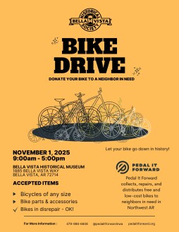 We are partnering with Pedal It Forward for new and used bicycles, parts, and accessories for free and/or low cost distribution to neighbors in need in NWA. We will also hold a raffle for a new vintage style bicycle donated by Pedal It Forward as a fundraiser for the Bella Vista Historical Museum's building expansion fund.