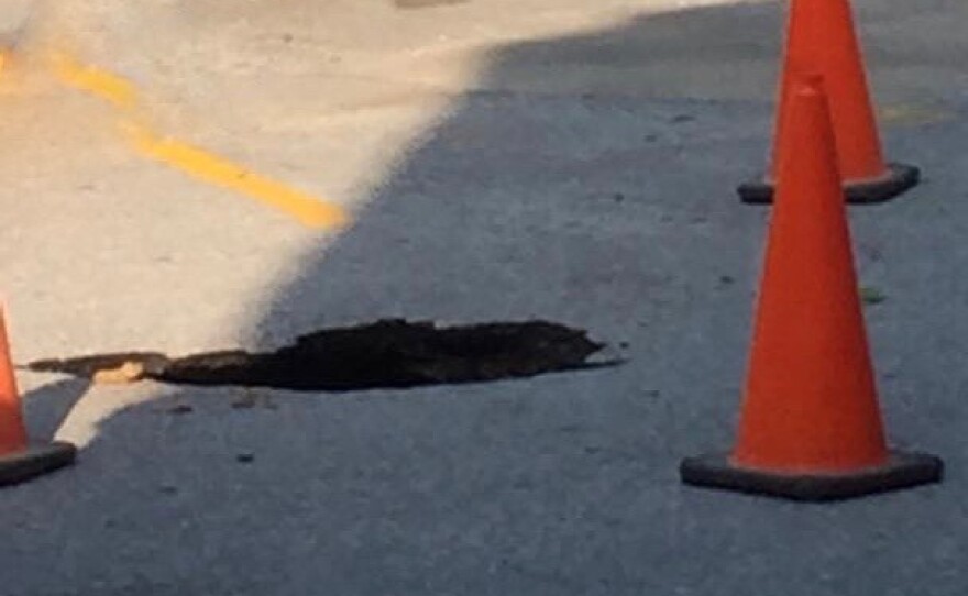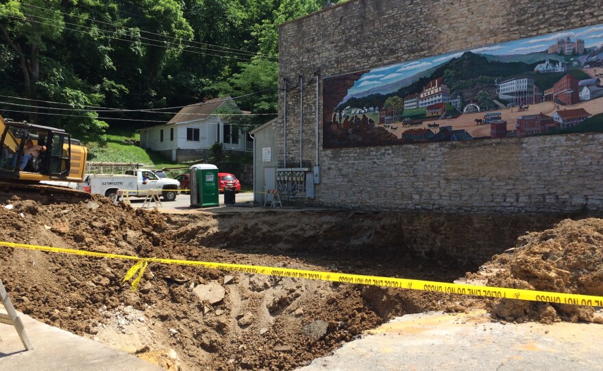 A section of hand-built aqueduct in downtown Eureka Springs has collapsed beneath a commercial parking lot, causing a cave-in. The tunnel is a conduit for the spring-fed headwaters for East Leatherwood Creek and a downtown stormwater drainage system. Repairs are underway, and comprehensive measures are being taken to prevent future cave-ins downstream.