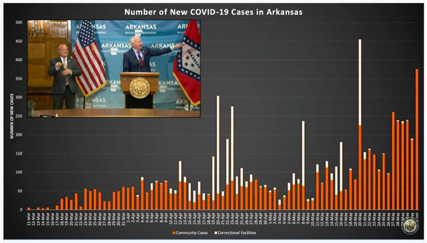 On Tuesday, Governor Asa Hutchinson reported the state's highest single-day increase in community cases of COVID-19 with 375 new positives out of more than 3,800 tests. Benton County had 65 new cases, meanwhile Washington County had 57. There were also an additional three deaths from the virus, bringing the total to 136. Of the active cases, 132 Arkansans are hospitalized, the highest such total since the pandemic began. This month, the state is planning to test every patient and staff member in nursing homes and the overall goal for June is to conduct 120,000 tests across Arkansas. Hutchinson also said any consideration of moving to phase two of reopening businesses and activities is on pause given the increase in cases and hospitalizations. The governor also addressed protests across the state and said he has not asked for any federal military aid and does not plan to do so. To watch the full briefing, click here.
