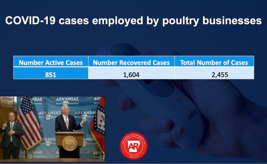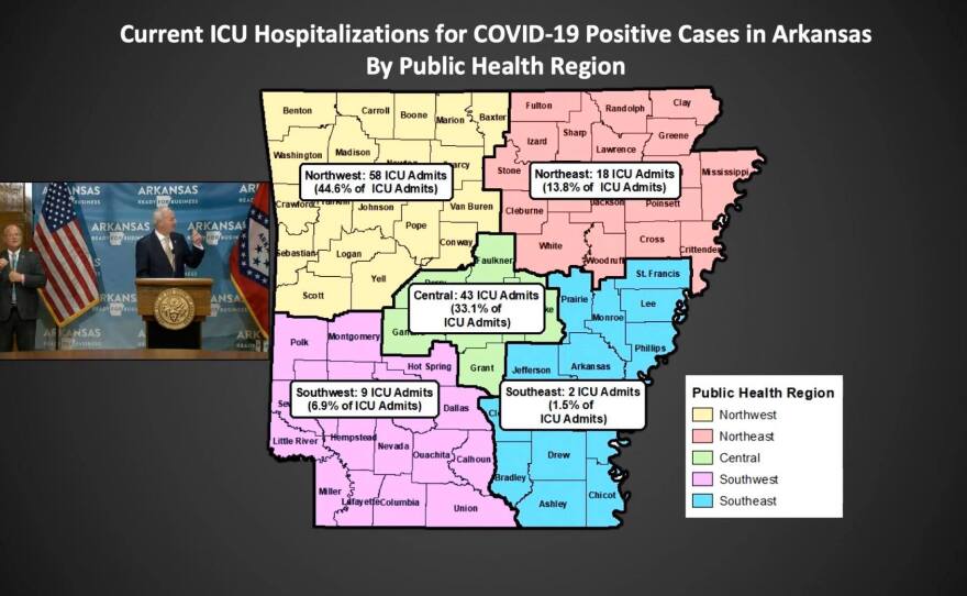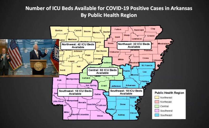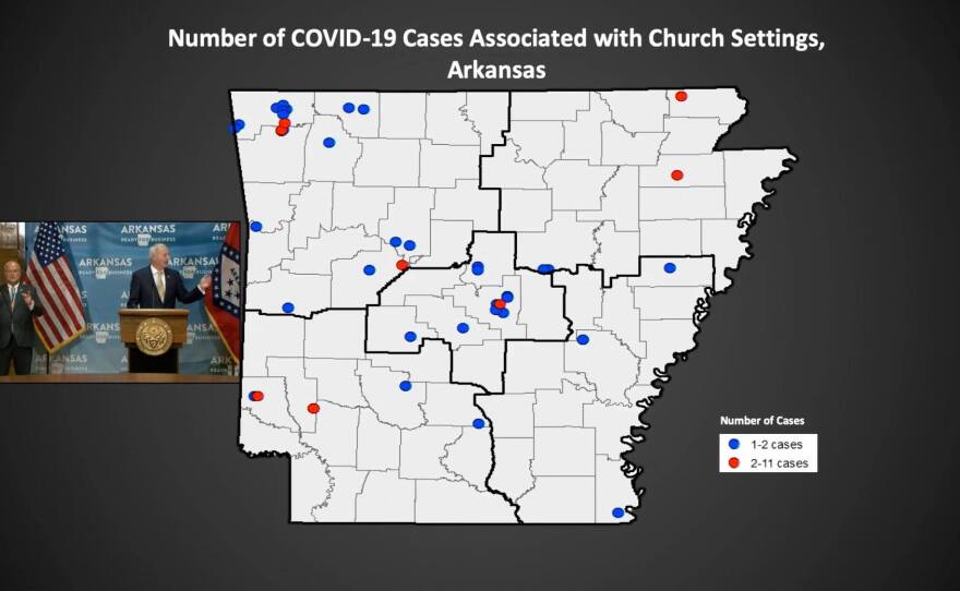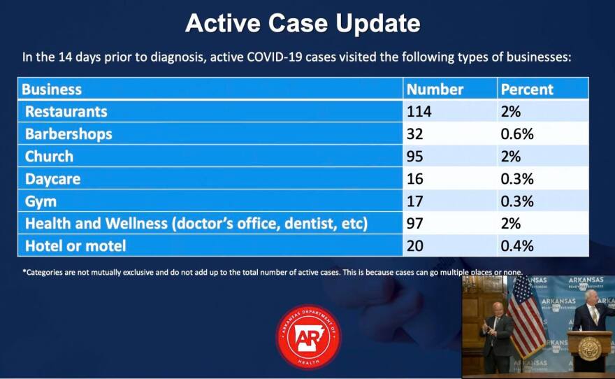 At Friday's coronavirus response briefing, Governor Asa Hutchinson reported an additional 678 new cases of COVID-19, including 669 community cases, making for the highest single-day rise in community cases yet. Washington County reported 122 new cases, Benton County had 68 and Sebastian County had 33. The governor discussed hospital capacities in the state's five public health regions, but did not provide a breakdown by county. According to Hutchinson and Secretary of Health Nate Smith, so far, contact tracing done in Arkansas doesn't indicate a large number of infections can be connected to restaurants, barber shops or bars, all of which are businesses that have reopened with some restrictions in the past two months. But, Smith said they're concerned about the coronavirus clusters at certain places of worship and once again urged those establishments to follow guidelines like social distancing and face masks. As both the governors of Texas and Florida reinstate some measures they had rolled back, Hutchinson said the state is watching the sources of transmission in Arkansas and would, if necessary, consider further action. To watch the full briefing, click here.