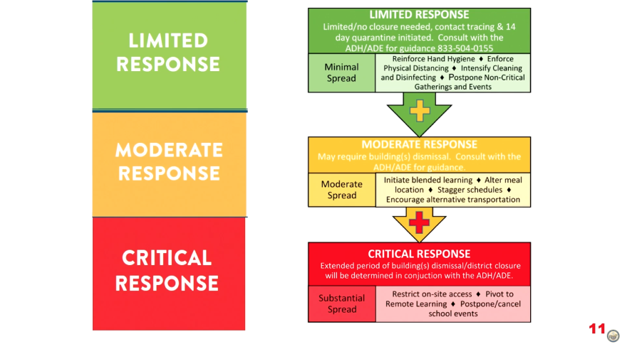 Gov. Asa Hutchinson has announced the 2020-2021 school year start date will be pushed back from Aug. 13 to the week of Aug. 24, but no later than Aug. 26. He also announced a three-tiered response system for when a student or teacher tests positive for COVID-19.