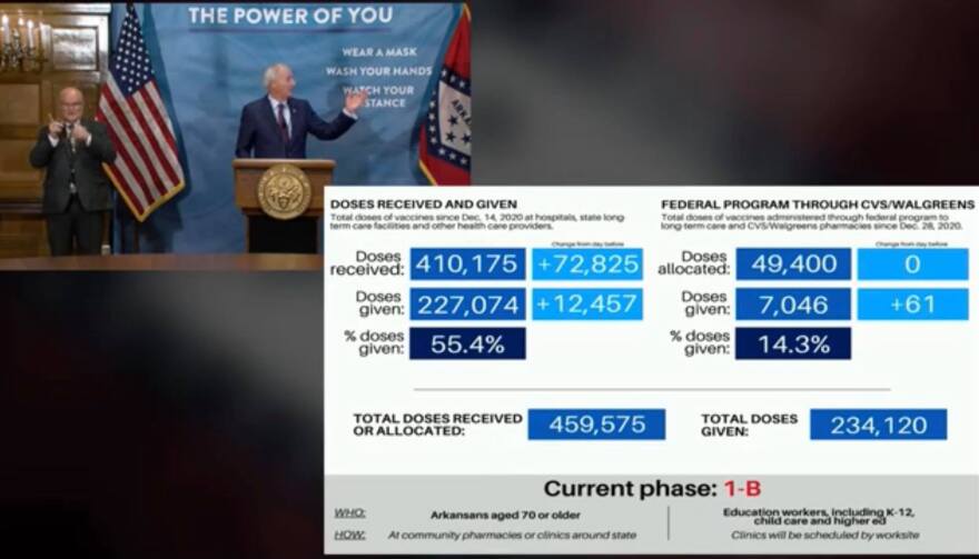 During his weekly coronavirus response briefing Tuesday, Gov. Asa Hutchinson said the state is making progress on getting the COVID-19 vaccine into Arkansans’ arms. He cited rankings from The New York Times, which put the Natural State in tenth place with 6.5 percent of the population vaccinated against the virus so far. Hutchinson also said he wants Arkansans to know the state is making sure second doses of the vaccine are being allocated for those who’ve received the first dose. He acknowledged the state is still constrained by supply from the manufacturers, which is controlled by the federal government, which then allocates the doses to each state. While Arkansas has had a consistent supply of the vaccine each week, it hasn’t been increasing like he'd hoped. However, that could change next week. Right after the briefing, Hutchinson attended a meeting between the National Governors Association and the Biden administration where it was announced the federal government has purchased 200 million additional doses of the Pfizer and Moderna vaccines. President Biden also increased the weekly vaccine supply to states, tribes and territories from the current 8.6 million doses to a minimum of 10 million doses each week, which means vaccination allotments for states are expected to increase by around 16 percent starting next week. When asked about the possibility of that announcement based on reports from national media outlets, Hutchinson said the state welcomes the increase in doses and will handle the increased supply the same way it's been handling the current supply. Hutchinson also provided an update on vaccinations being carried up by CVS and Walgreens under a federal contract. He said it won’t be long before the pharmacies are expected to fulfill their obligation of vaccinating residents and staff at long-term care facilities assigned to them. The state is working with both companies to use their extra doses to vaccinate people over the age of 70. Arkansas Healthy Secretary Dr. Jose Romero had other obligations Tuesday, so Dr. Jennifer Dillaha spoke at the briefing instead. Dillaha is the state’s medical director for immunizations and outbreak response. She reminded Arkansans who’ve been fully vaccinated that they should continue to wear masks, social distance, avoid crowds and wash their hands as new strains of COVID-19 emerge around the world. So far, there are no confirmed cases of the variants in Arkansas. Governor Hutchinson also provided an update on the state’s unemployment rate, which dropped from 6.3 percent in November to 4.2 percent last month. He attributed the drop to the state's balanced approach to reopening businesses. During the question and answer portion of the briefing, Hutchinson was asked about the Pandemic Unemployment Assistance system run by the state as people report long lines at unemployment offices across the state. He said the system is undergoing an update to reflect the revised benefit amounts and extensions. The governor was also asked about the lawsuit that was filed by Northwest Arkansas bar owners earlier this month and dismissed by a Pulaski County judge Tuesday morning. Hutchinson said the state has followed the law in issuing an 11 p.m. curfew on those establishments and it remains to be seen whether that executive order will be extended beyond Feb. 3. For the full coronavirus response briefing, click here.